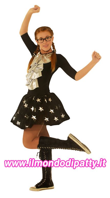 Anche le due leader della Pretty Land School of Arts adorano il nero: riescono poi a personalizzare gli abiti con dettagli spiritosi, divertenti, e soprattutto molto fashion. Ecco ad esempio il look total black di Patty. La nostra Laura Esquivel indossa un vestito di base nero, ma illuminato da stelline d’argento sulla gonna di velo. Dello stesso colore le balze che ornano il body per tutto il busto: elastici in tinta e Cover Your Bones nere… cosa ve ne pare?